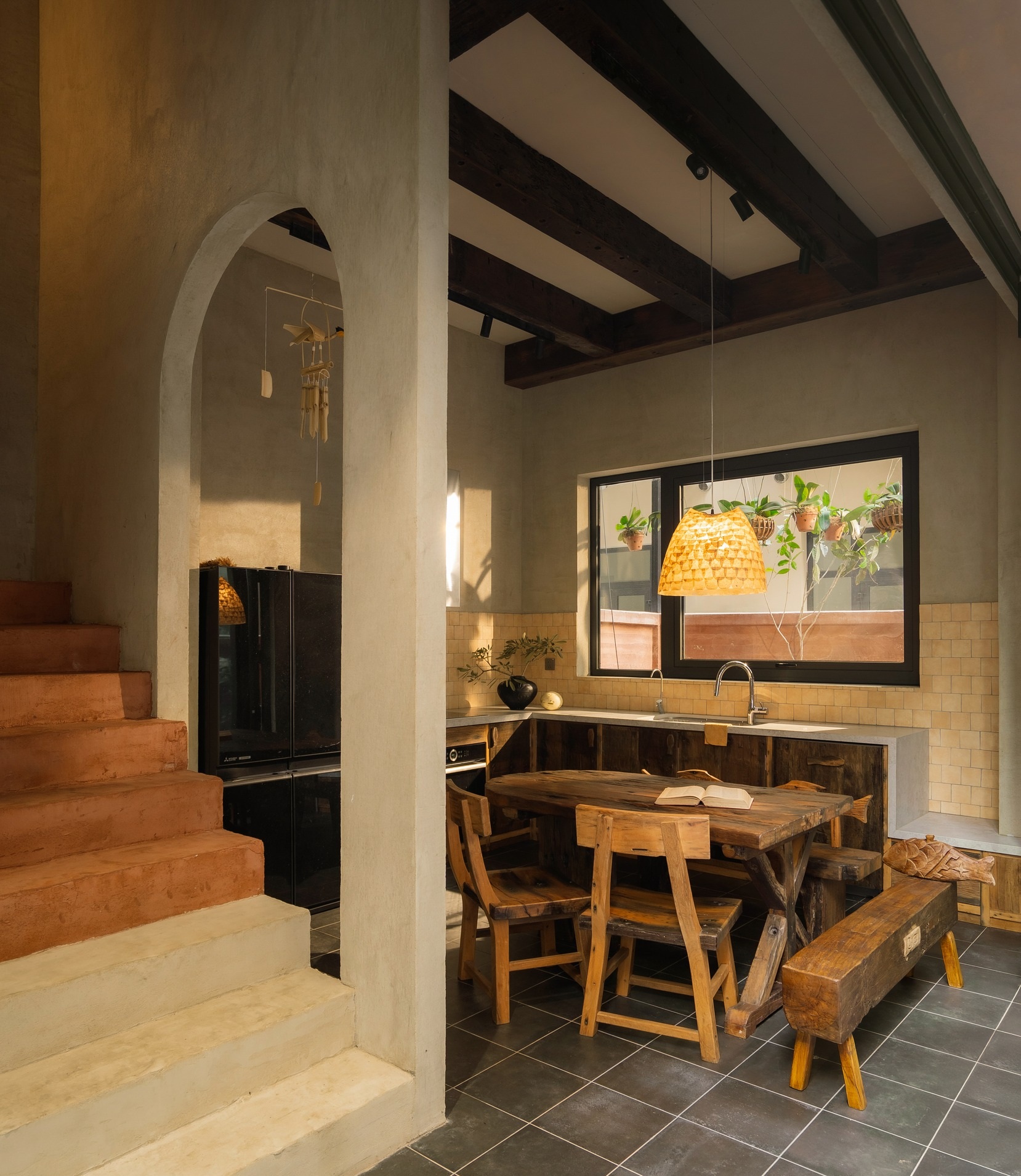 Quán cà phê Mộc Con cá Rô Zen Soha sử dụng chủ đạo gỗ tự nhiên, tre, nứa, đất nung và đá mộc. Những bề mặt thô mộc, vân gỗ nguyên bản và sắc nâu trầm ấm gợi nhớ đến gian nhà quê xưa, nhưng được xử lý tinh tế theo ngôn ngữ thiết kế đương đại. Ánh sáng tự nhiên được dẫn dắt nhẹ nhàng qua mái hiên, cửa gỗ và mảng xanh, tạo nên cảm giác thư thái, tĩnh tại và rất thiền.
