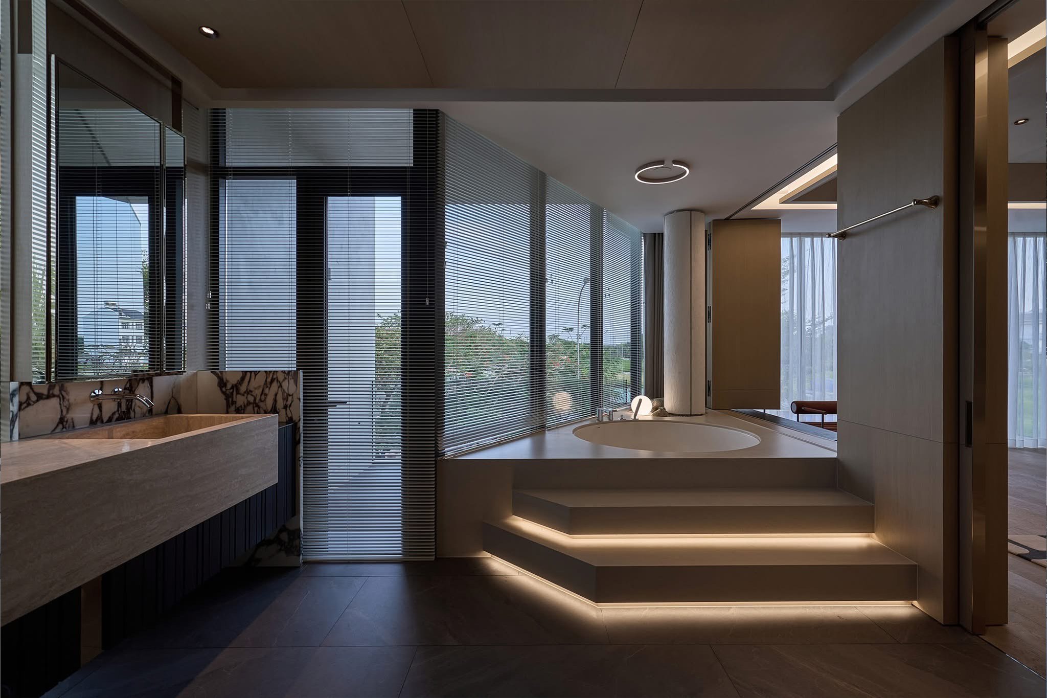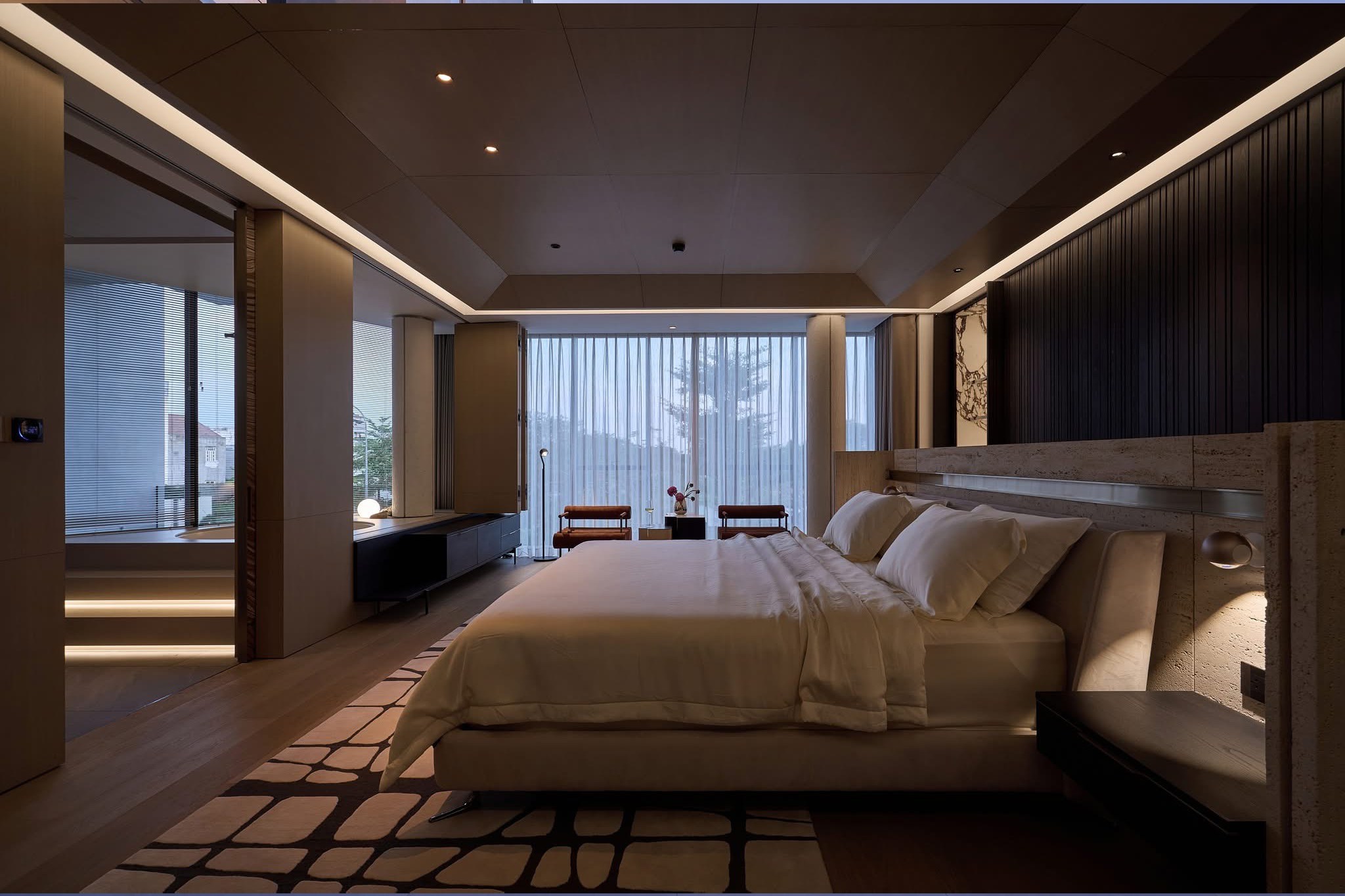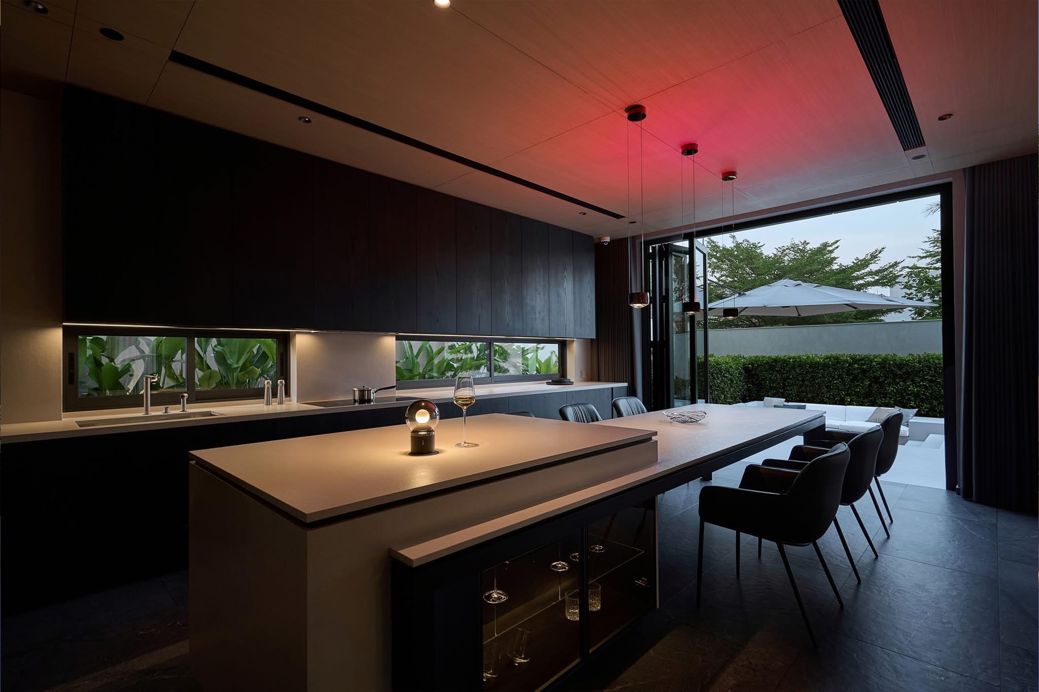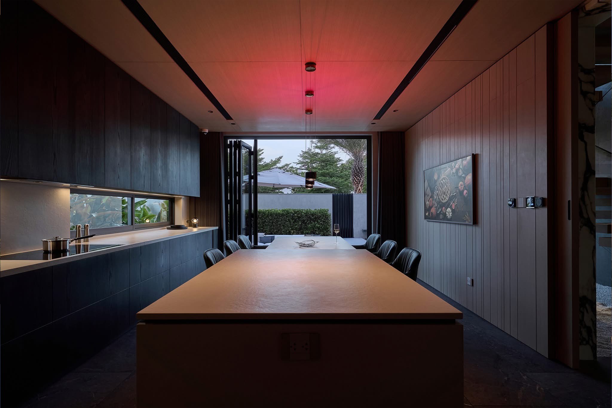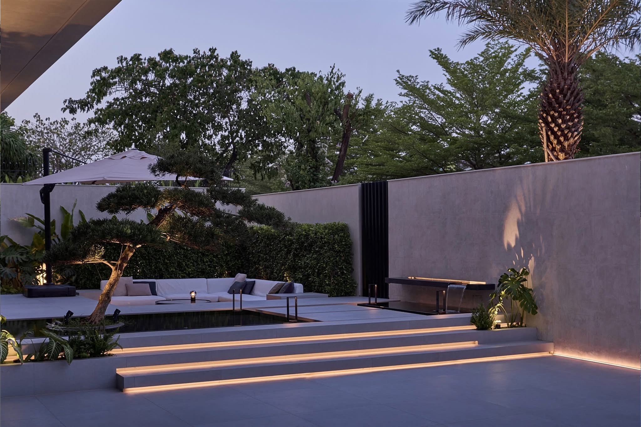 Thiết kế mở là điểm nhấn quan trọng, giúp phòng khách, khu bếp và không gian nghỉ ngơi kết nối liền mạch với sân vườn xanh mát. Hệ thống cây xanh, mặt nước và lối dạo thiền được bố trí hài hòa, mang thiên nhiên len sâu vào từng nhịp sống, tạo nên bầu không khí trong lành và cảm xúc cân bằng cho gia chủ.