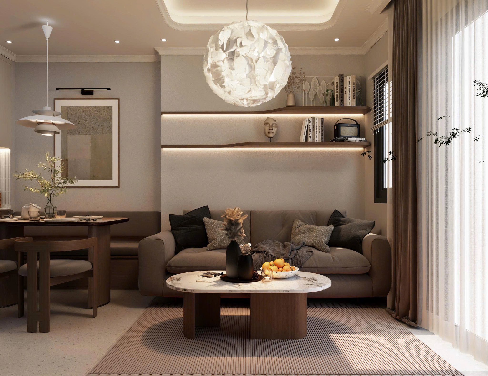 Điểm nổi bật của nhà phố Zen Soha nằm ở bảng màu trung tính ấm như nâu gỗ, be, kem, xám nhạt, kết hợp cùng vật liệu tự nhiên cao cấp. Gỗ mộc, đá tự nhiên, vải thô và ánh sáng vàng dịu được sử dụng có chủ đích, giúp không gian luôn ấm cúng nhưng không nặng nề, sang trọng nhưng không phô trương.