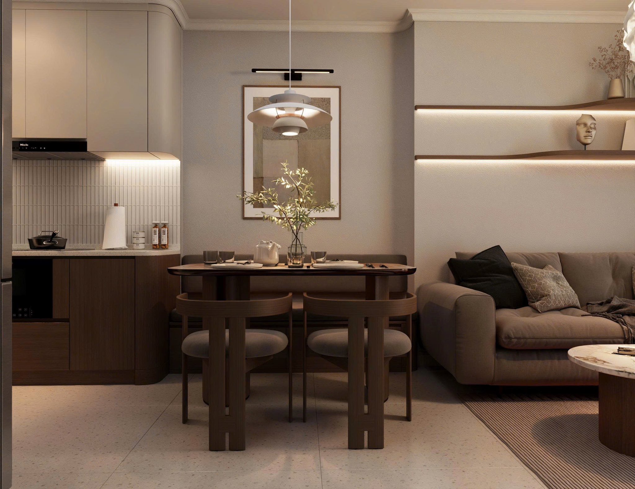 Triết lý “ít nhưng tinh” được thể hiện rõ trong từng chi tiết nội thất. Đường nét thiết kế gọn gàng, hạn chế trang trí rườm rà, tập trung vào công năng và trải nghiệm cảm xúc. Mỗi món đồ đều có vai trò riêng, góp phần tạo nên tổng thể nhà phố Zen Soha vừa tiện nghi, vừa mang chiều sâu thẩm mỹ.